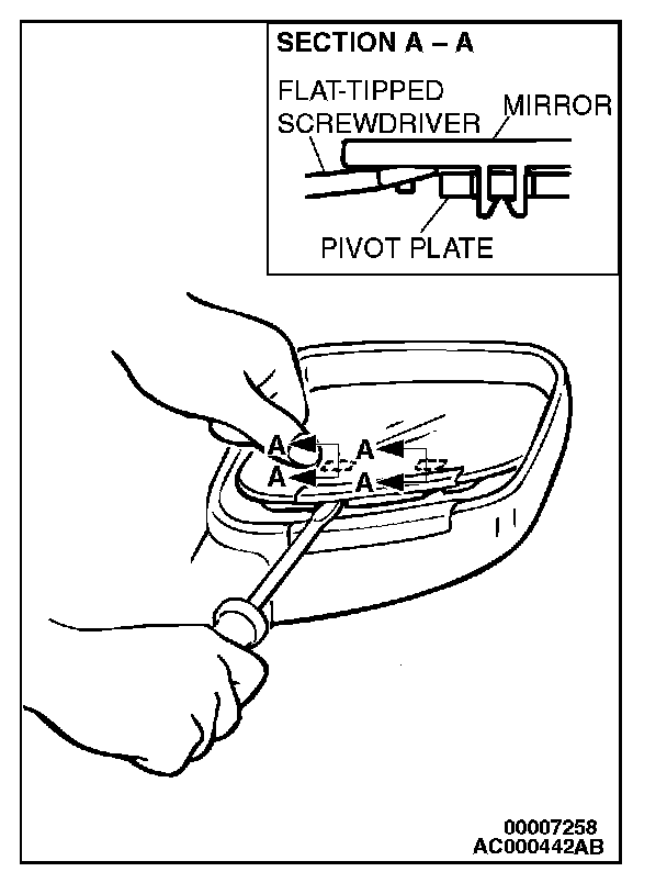 Push the top of the mirror with your hand to tilt it and attach the protective tape as shown in the illustration. Then insert a flat-tipped screwdriver in between the notch at the rear of the mirror and the pivot plate and disengage the bottom of the mirror.