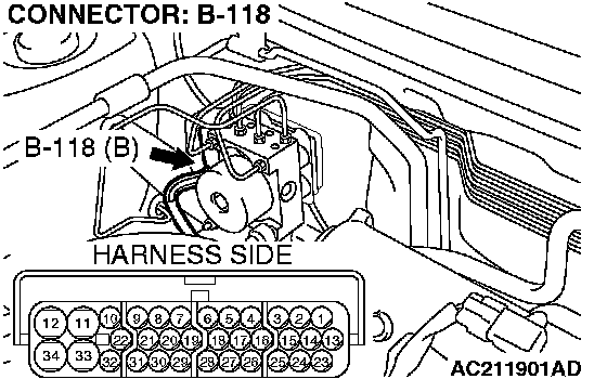 1. Disconnect ABS-ECU connector B-118 and measure at the harness side.
