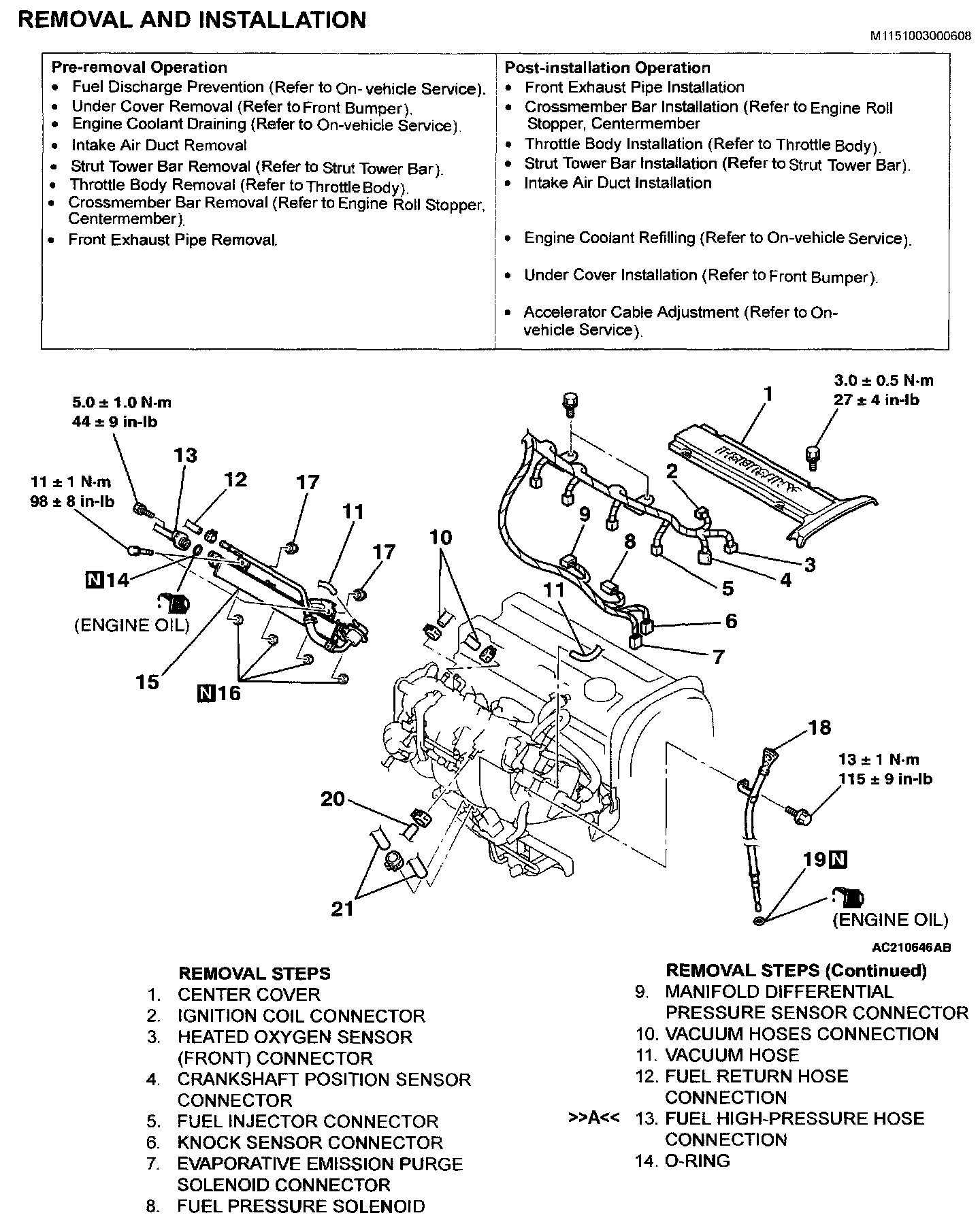[[A]] FUEL RAIL, FUEL INJECTOR, FUEL RETURN PIPE AND FUEL PRESSURE REGULATOR ASSEMBLY REMOVAL
