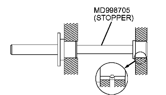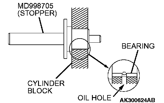 2. Using special tool MD998705, install the rear bearing. Make sure that the oil hole of the bearing is aligned with that of the cylinder block.