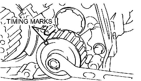 NOTE: The timing marks will be aligned when the belt is installed since the intake camshaft turned slightly clockwise by the force of the valve springs.