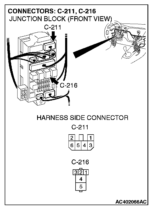 NOTE: Also check junction block connector C-211 for loose, corroded, or damaged terminals, or terminals pushed back in the connector. If junction block connector C-211 is damaged, repair or replace the connector as described in Harness Connector Inspection.