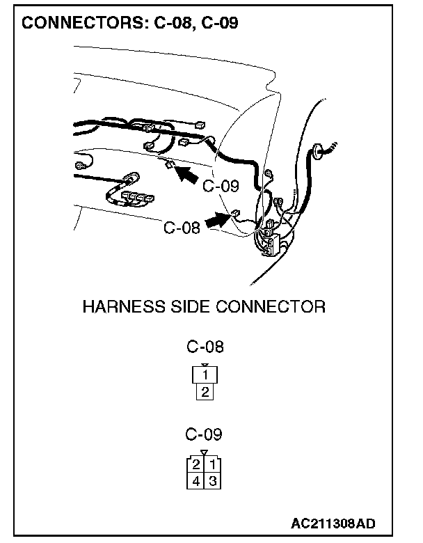 STEP 8. Check resistor connector C-09 and blower motor connector C-08 for loose, corroded or damaged terminals, or terminals pushed back in the connector.