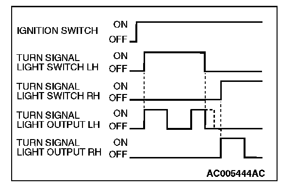 The turn-signal light output (flashing signal) is turned ON when the turn-signal light ignition switch is ON and the turn-signal light switch is ON (LH or RH.) If the front turn-signal light or rear turn-signal light bulb has burned out, the flashing speed increases to indicate that the bulb has burned out.