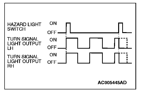 The hazard warning lights output (flashing) is turned ON when the hazard switch is turned OFF to ON. When the switch is turned ON again, the output is turned OFF.