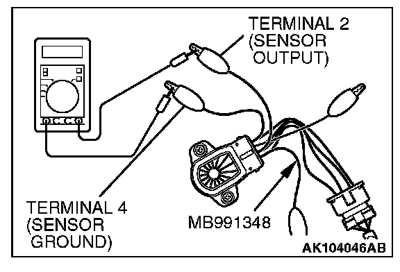 2. Connect a digital voltmeter between throttle position sensor terminal No.2 (sensor output) and terminal No.4 (sensor ground).