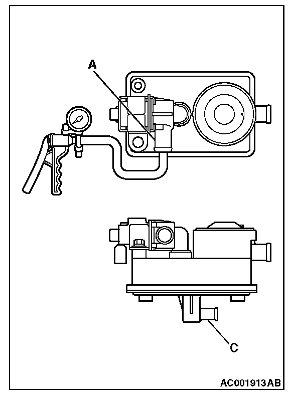 ORVR VENT VALVE MODULE CHECK1. Blow air through orvr vent valve module nipple (A). Check that the air flows out of nipple (B) and nipple (C).