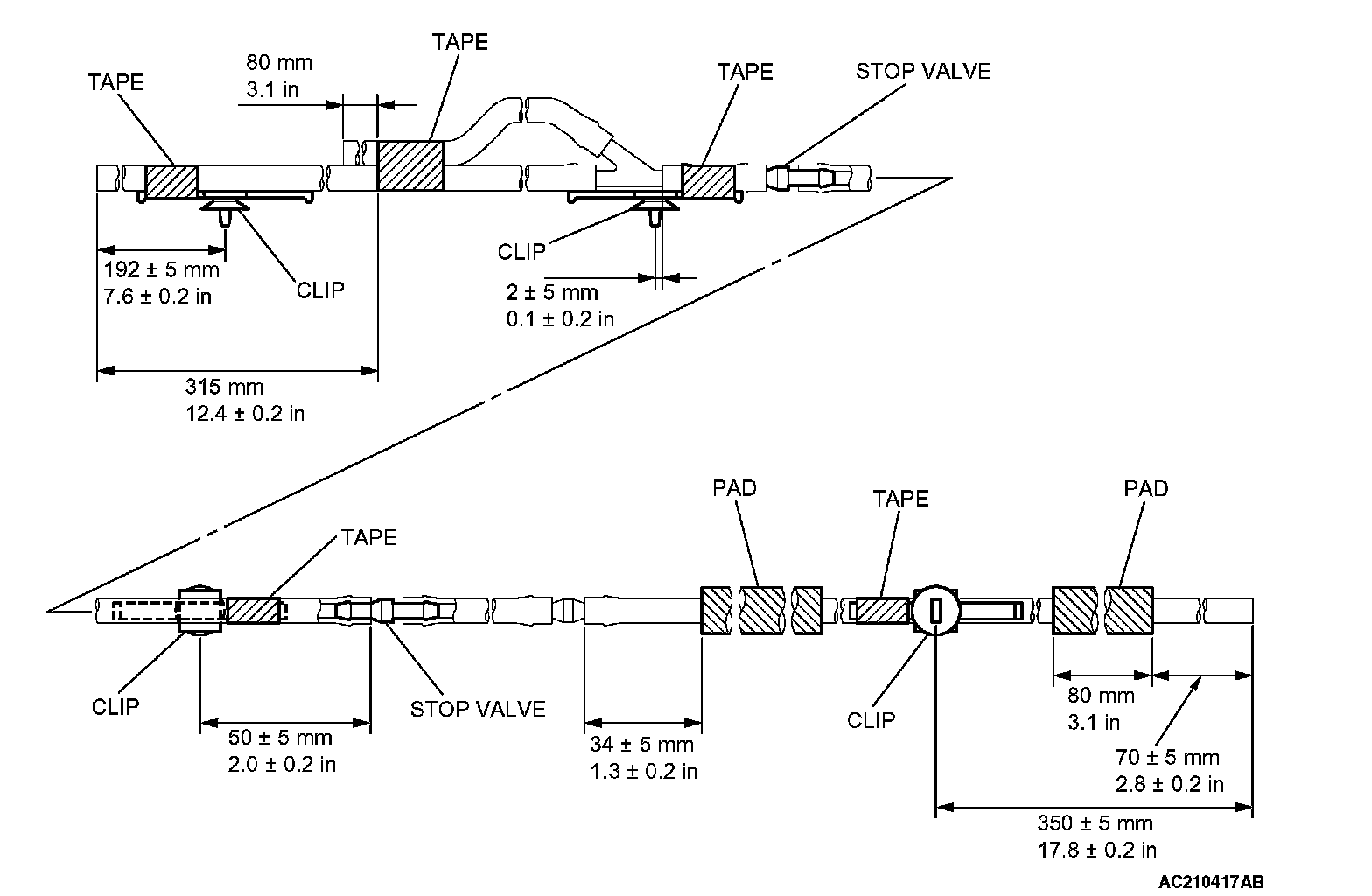 1. After the rubber tubes, the three-way joint, the stop valves and the joint are assembled, affix the clips, the pads and tape to the rubber tubes as shown.