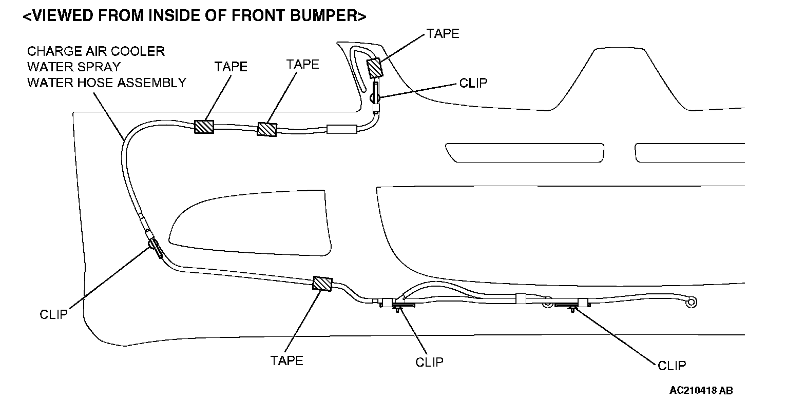 2. Use clips and tapes to locate the charge air cooler water spray water hose assembly in position.