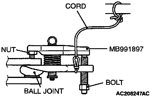 ^ Do not remove the nut from ball joint. Loosen it and use special tool MB991897 to avoid possible damage to ball joint threads.