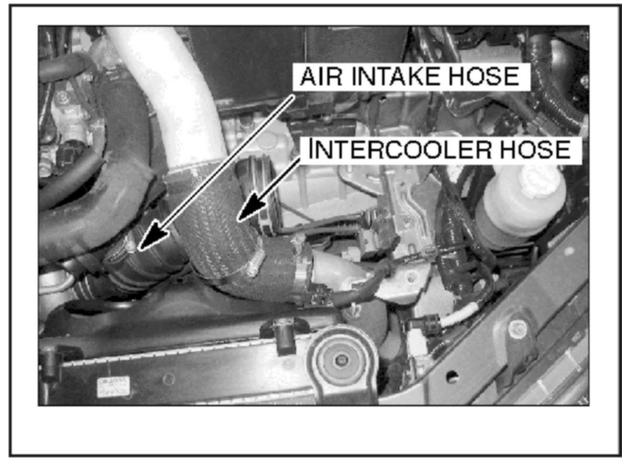 8. Reinstall the intercooler hose, air intake hose, air flow connector and clamp, air cleaner assembly, and air intake duct.