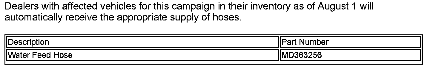 A letter will be sent to all owners of affected vehicles telling them to bring their vehicle to their Mitsubishi Motors dealer to have the turbocharger coolant hose replaced. A copy of the customer notification letter is shown in this bulletin.