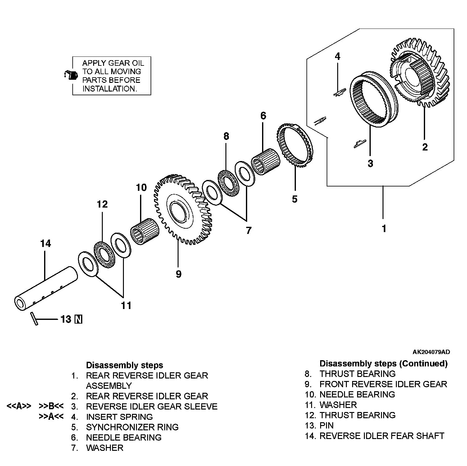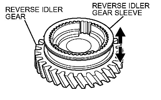 Check the front and back ends of the inner splines of the reverse idler gear sleeve for damage. Check the helical gear teeth and clutch gear teeth of the reverse idler gear for damage and excessive wear. Check the front, back, and inner surfaces of the reverse idler gear for damage and excessive wear.
