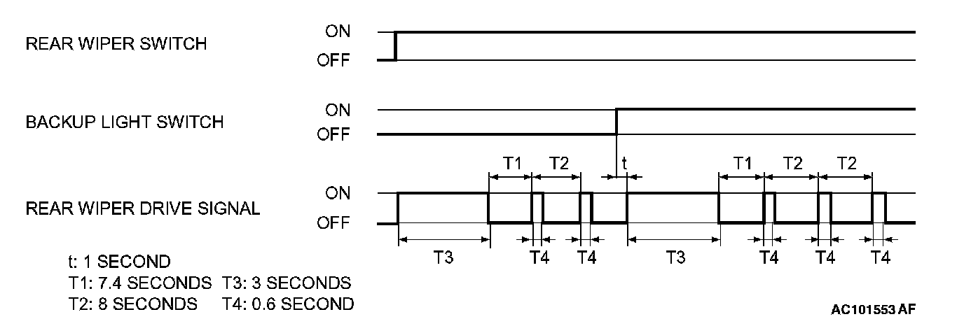 If the shift lever is moved to the reverse "R" position when the rear wiper switch is turned ON and the ignition switch is in any position other than OFF, the backup light switch turns ON. One second later, the ETACS-ECU turns the rear wiper drive signal ON for 3 seconds (approximately 2 operations), to clear the rear view, and then returns to intermittent operation at a 7.4 to 8 seconds cycle.