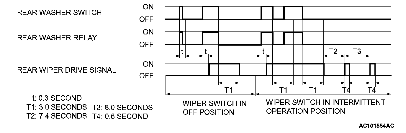 When the ignition switch is at the ACC or ON position, if the rear washer switch is turned ON, the ETACS-ECU turns ON the rear washer relay. The rear wiper drive signal is turned ON in 0.3 seconds until 3.0 seconds after the rear washer switch goes OFF to operate the rear wiper continuously.