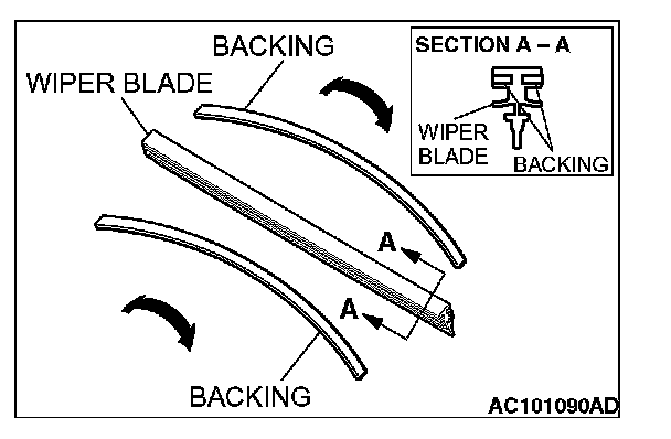 CAUTION: Ensure that the backings are bent in the shown direction, and then install the backings to the wiper blade.