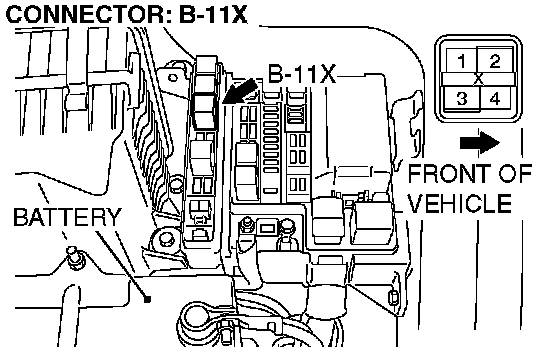 STEP 6. Check the harness for open circuit or short circuit to ground between A/T control relay connector B-11X terminal 1 in the engine component relay box and battery.