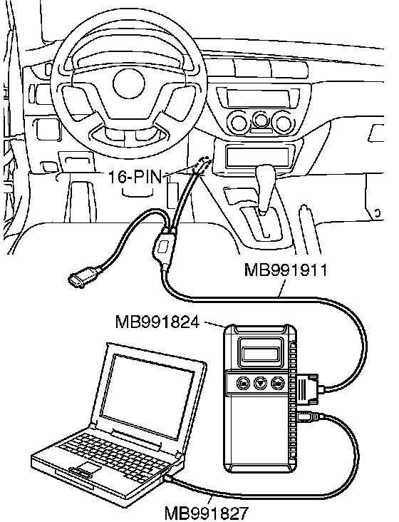 CAUTION: To prevent damage to scan tool MB991958, always turn the ignition switch to the "LOCK" (OFF) position before connecting or disconnecting scan tool MB991958.
