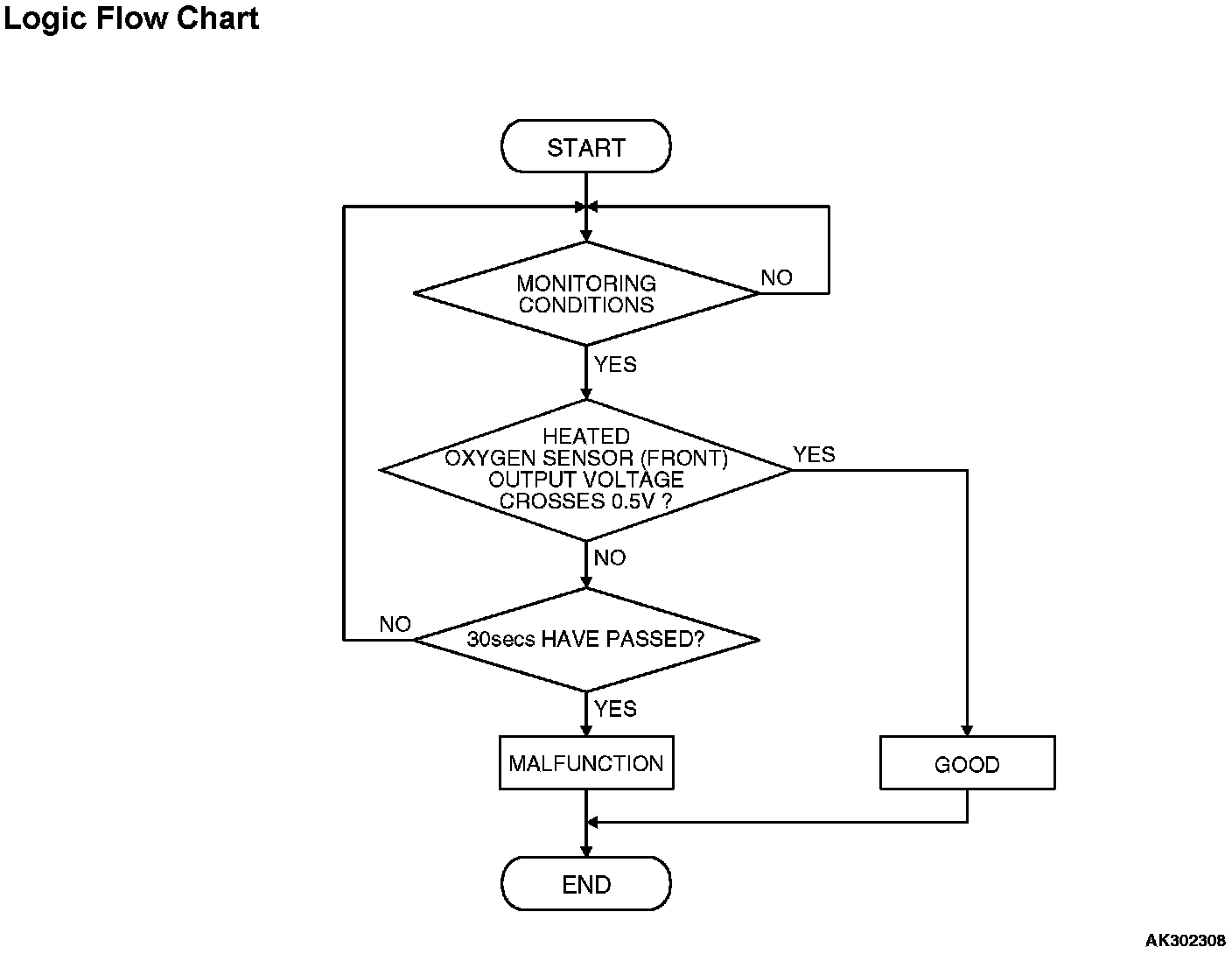 - If the heated oxygen sensor (front) output does not cross 0.5 volts while monitoring the heated oxygen sensor (front) output, a malfunction is determined to have occurred.