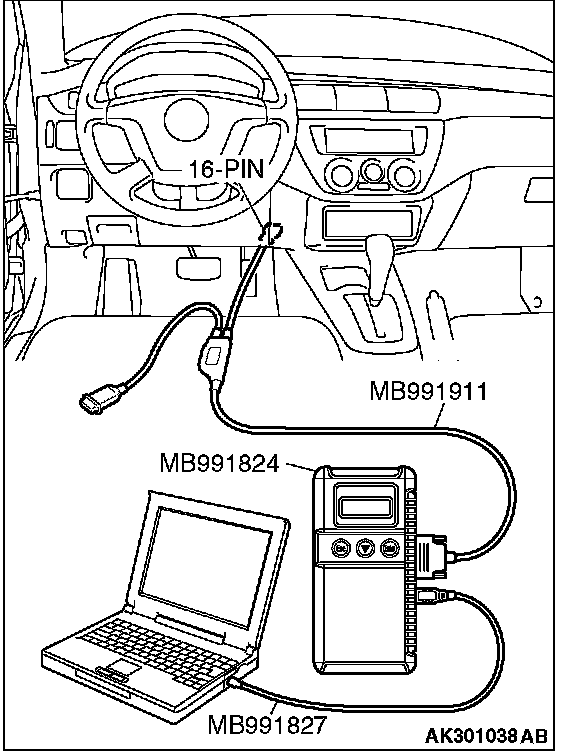 CAUTION: To prevent damage to scan tool MB991958, always turn the ignition switch to the "LOCK" (OFF) position before connecting or disconnecting scan tool MB991958.