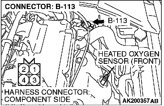 1. Disconnect the heated oxygen sensor (front) connector B-113 and connect test harness special tool, MD998464 to the connector on the heated oxygen sensor (front) side.