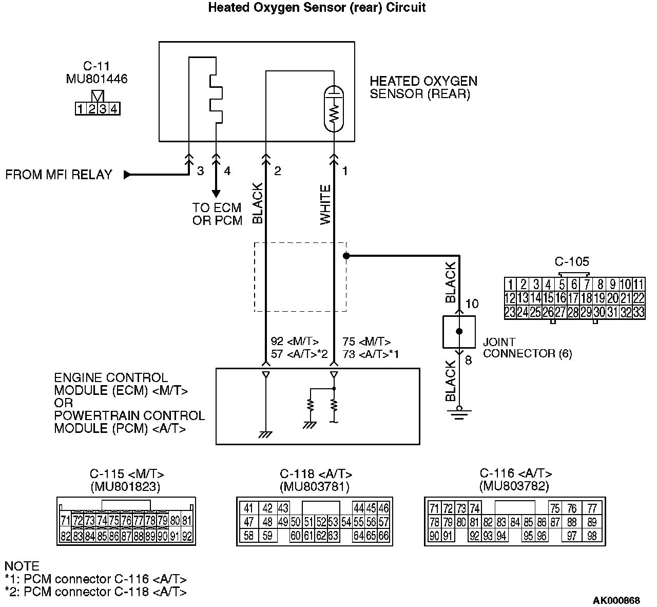 - Terminal No.2 of the heated oxygen sensor (rear) is grounded with ECM (terminal No.92)