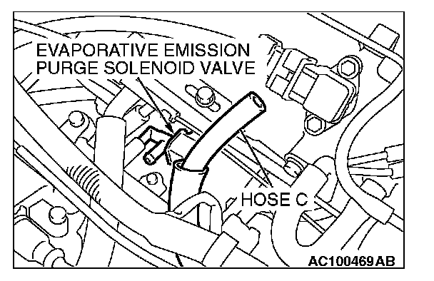 1. Disconnect hose C from the evaporative emission purge solenoid and connect a hand vacuum pump to the nipple of the evaporative emission purge solenoid.