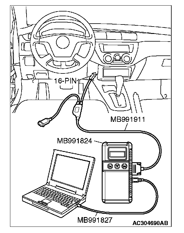 CAUTION: To prevent damage to scan tool MB991958, always turn the ignition switch to the "LOCK" (OFF) position before connecting or disconnecting scan tool MB991958.