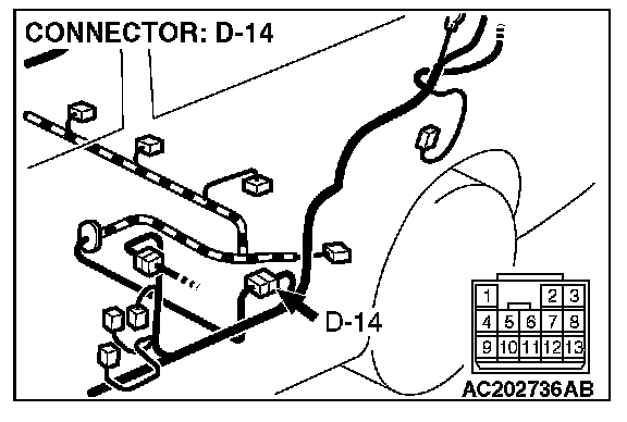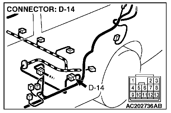 STEP 14. Check the harness wire between fuel tank differential pressure sensor connector D-09 terminal 2 and intermediate connector D-14 terminal 10 for damage.