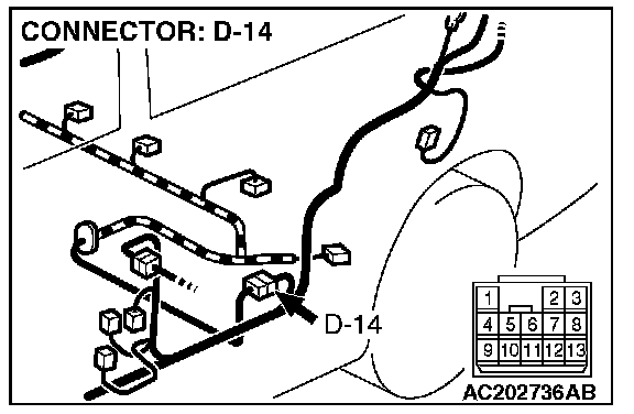 STEP 14. Check the harness wire between fuel tank differential pressure sensor connector D-09 terminal 2 and intermediate connector D-14 terminal 10 for damage.