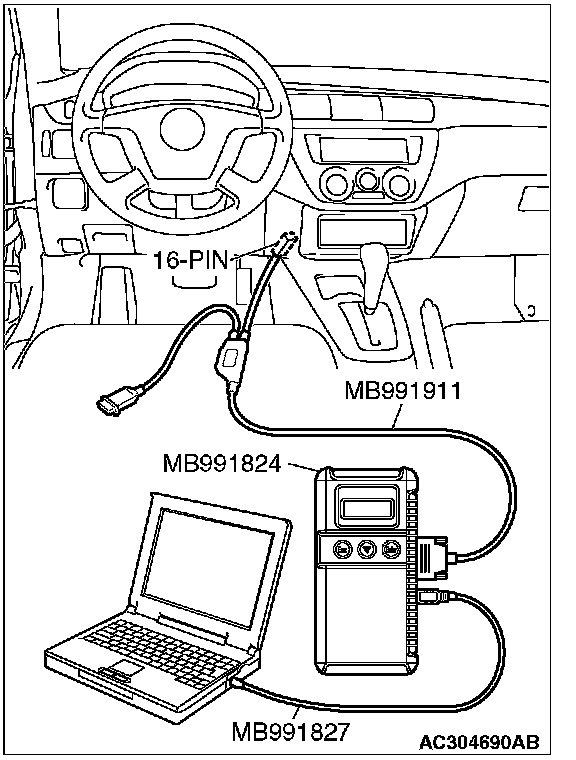 CAUTION: To prevent damage to scan tool MB991958, always turn the ignition switch to the "LOCK" (OFF) position before connecting or disconnecting scan tool MB991958.