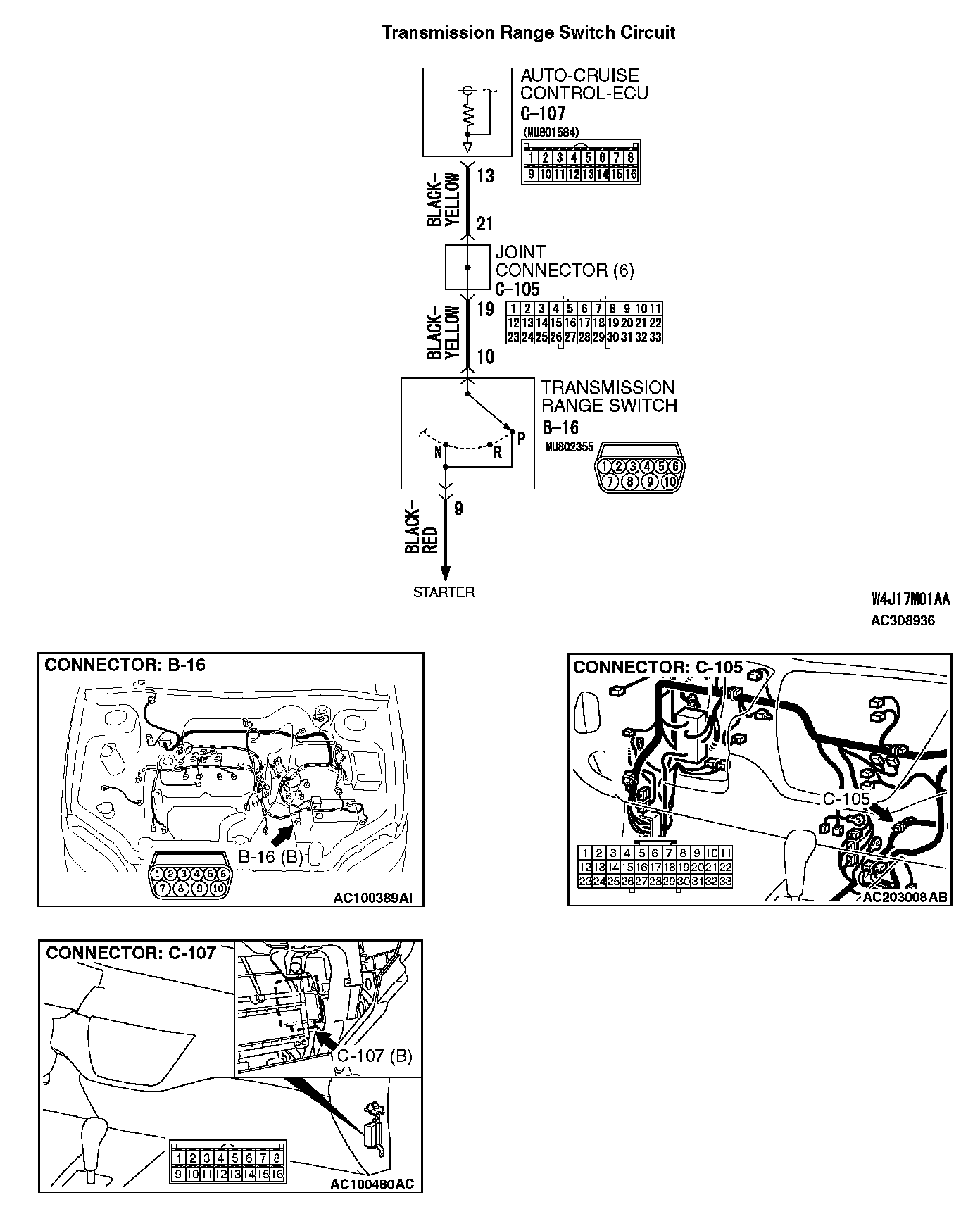 STEP 7. Check the harness wire between transmission range switch connector B-16 terminal 10 and auto-cruise control-ECU connector C-107 terminal 13 for damage.