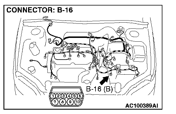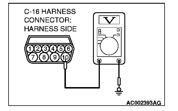 3. Measure the voltage between transmission range switch connector B-16 terminal 10 and ground by backprobing.