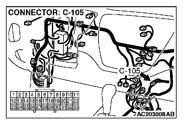 STEP 6. Check intermediate connector C-105 for loose, corroded or damaged terminals, or terminals pushed back in the connector.
