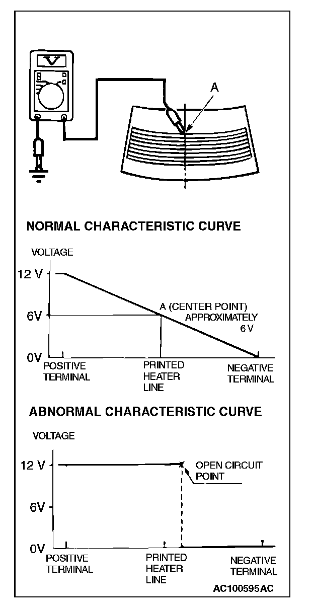 2. Turn on the rear window defogger switch, and use a voltmeter to measure the voltage in each printed heater at middle point A on the rear window glass.