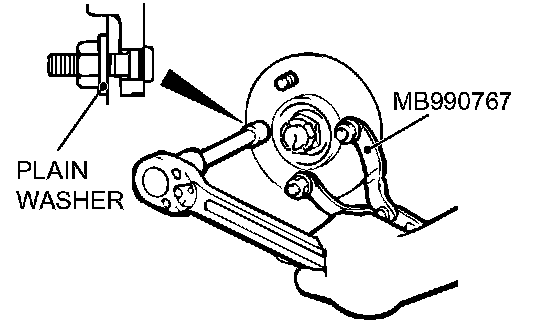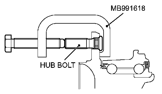 3. Install the plain washer to the new hub bolt, and install the bolt with a nut while holding the hub with special tool MB990767.