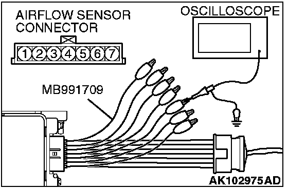1. Disconnect the volume airflow sensor connector, and connect the test harness special tool (MB991709) in between. (All terminals should be connected.)