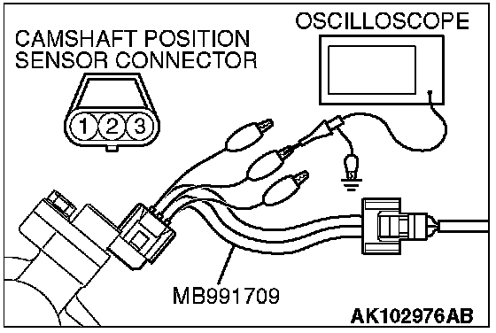 1. Disconnect the camshaft position sensor connector, and connect the test harness special tool (MB991709) in between. (All terminals should be connected.)