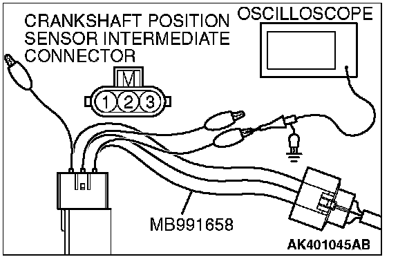 3. Disconnect the crankshaft position sensor connector, and connect the test harness special tool (MB991658) in between. (All terminals should be connected.)
