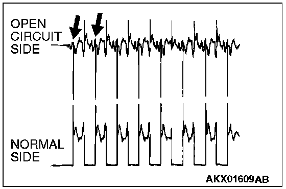 - Current is not supplied to the motor coil on the open circuit side. (Voltage does not drop to 0 volt.) Furthermore, the induced electromotive force wave pattern at the normal side is slightly different from the normal wave pattern.