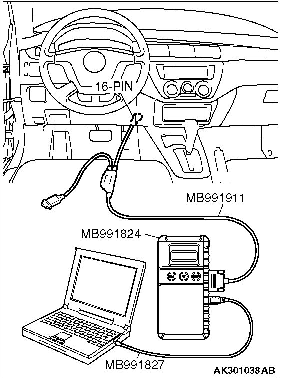 CAUTION: To prevent damage to scan tool MB991958, always turn the ignition switch to the "LOCK" (OFF) position before connecting or disconnecting scan tool MB991958.