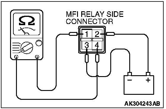 4. Check for continuity between the MFI relay terminals No.1 and No.4 while connecting and disconnecting the jumper wire at the negative battery terminal.
