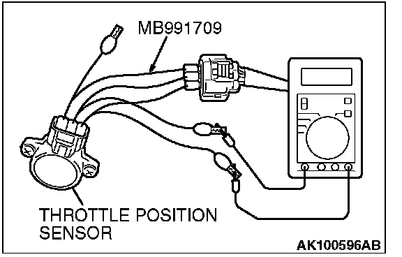1. Disconnect the throttle position sensor connector, and connect the special tool MB991709 in between. (All terminals should be connected.)