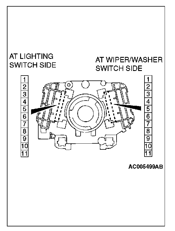 2. Among individual connectors of the column switch body remaining in the steering column, check for continuity between same number terminals (No.3-11).