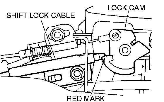 2. Fasten the shift lock cable at the position where the end of the shift lock cable is positioned above the red marking on the lock cam.