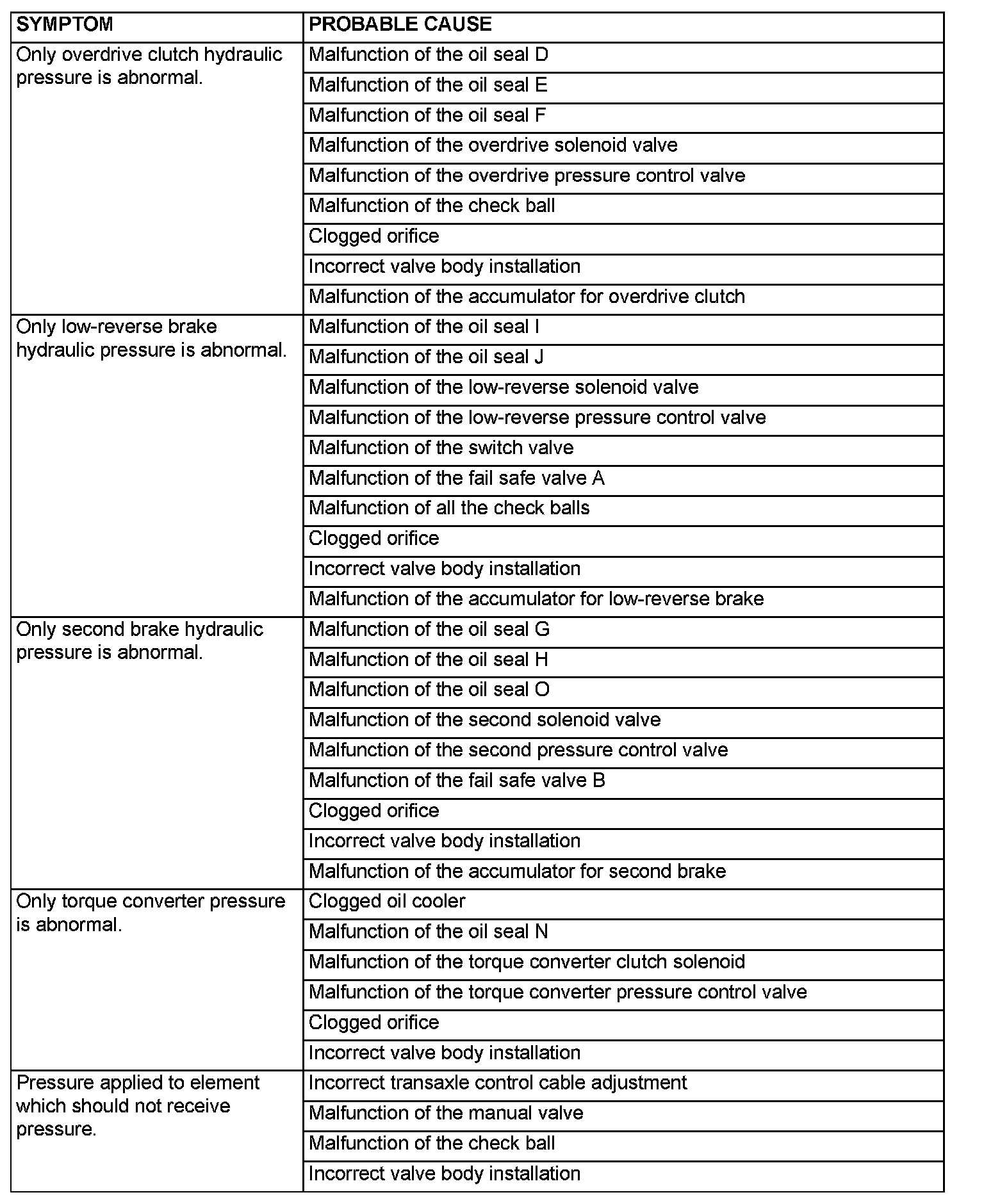 HYDRAULIC PRESSURE TEST DIAGNOSIS TABLE
