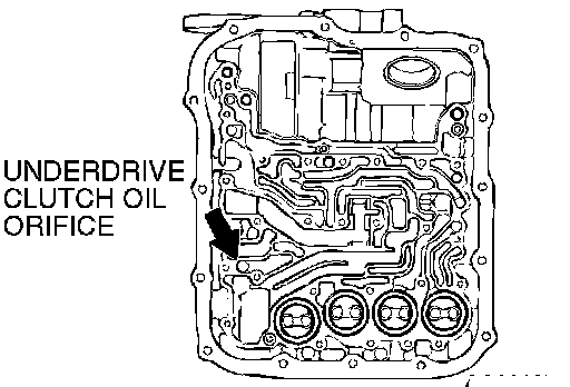 2) Blow 108 kPa (15 psi) compressed air into the underdrive clutch oil orifice of the transaxle case, and check if the underdrive clutch piston moves and air pressure is maintained in that condition.