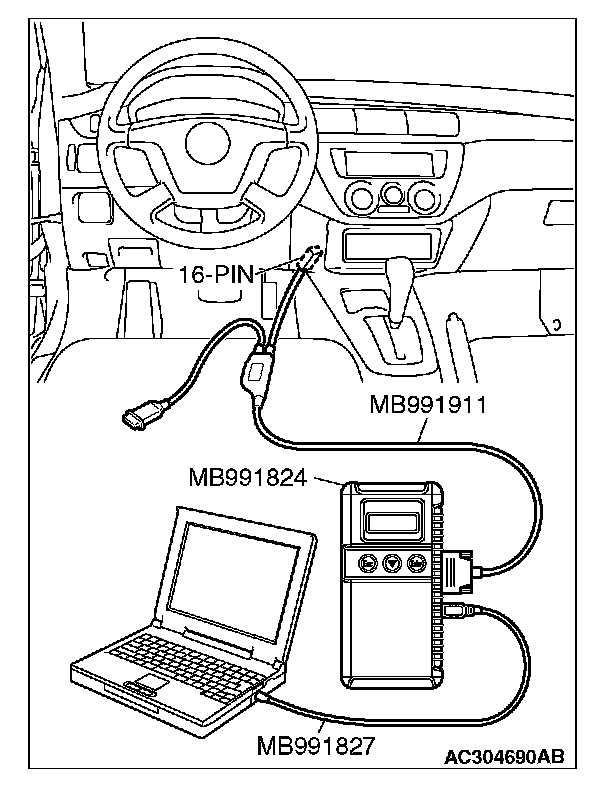 CAUTION: To prevent damage to scan tool MB991958, always turn the ignition switch to the "LOCK" (OFF) position before connecting or disconnecting scan tool MB991958.