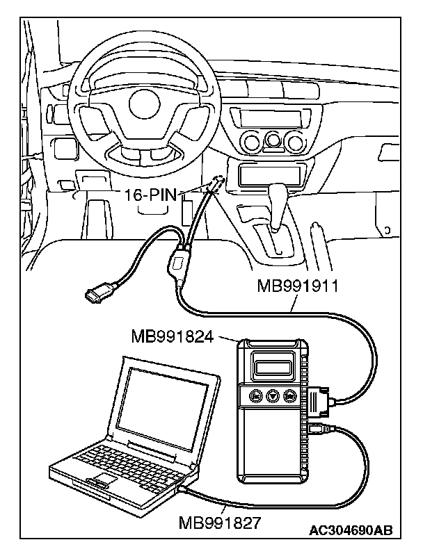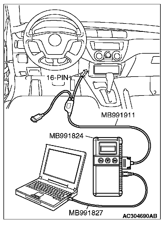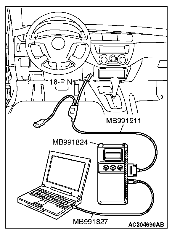 CAUTION: To prevent damage to scan tool MB991958, always turn the ignition switch to the "LOCK" (OFF) position before connecting or disconnecting scan tool MB991958.
