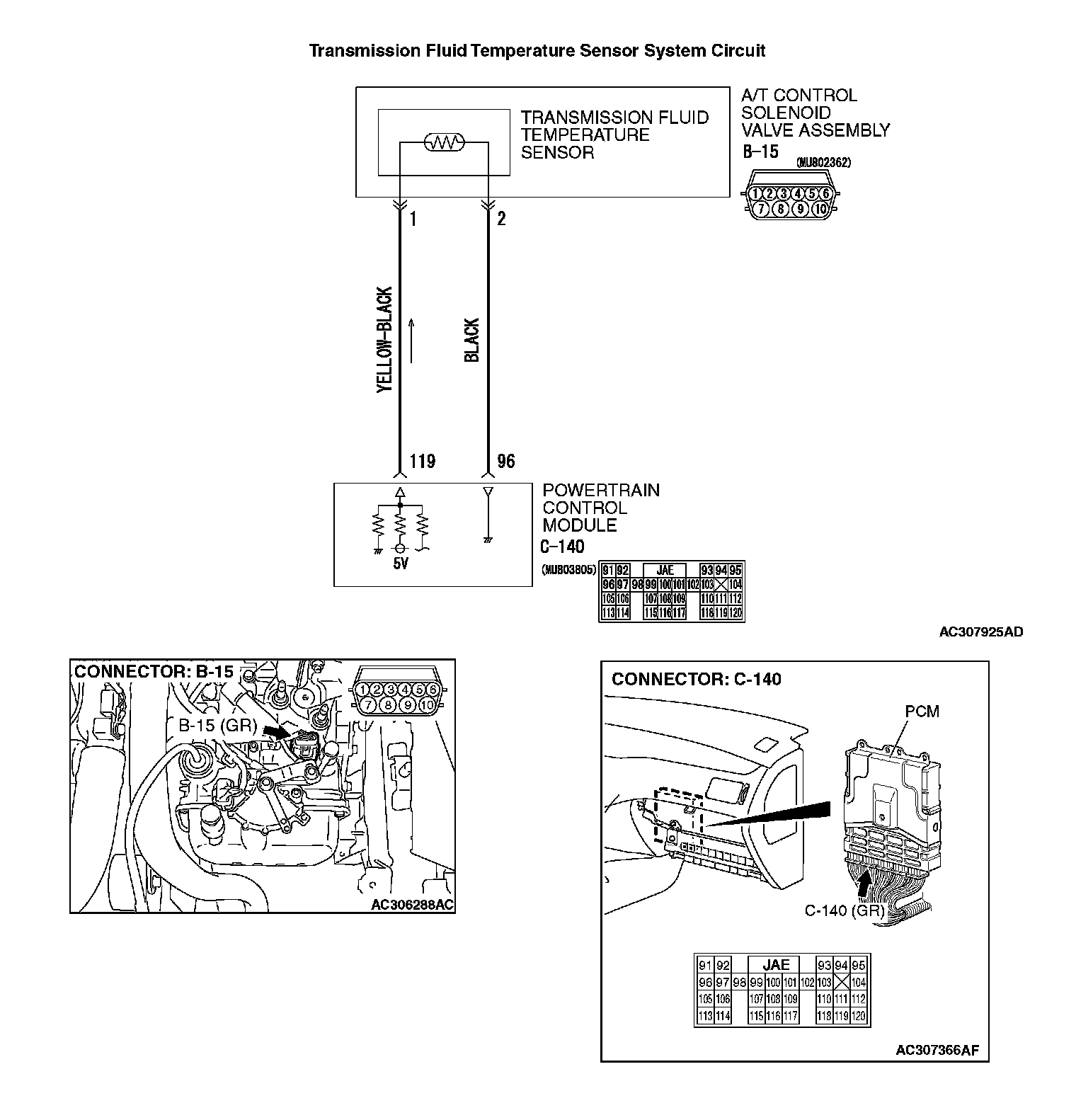 ^ The PCM (terminal 119) applies 5 volts to the transmission fluid temperature sensor output terminal (terminal 1).